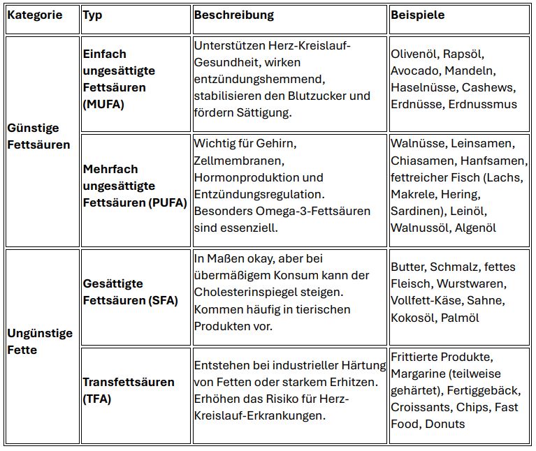 Fette sind lebensnotwendig, doch nicht alle Fette wirken gleich auf deinen Körper. Sie erfüllen verschiedene Aufgaben: Energieversorgung, Zellaufbau, Hormonproduktion und Aufnahme fettlöslicher Vitamine (A, D, E, K).